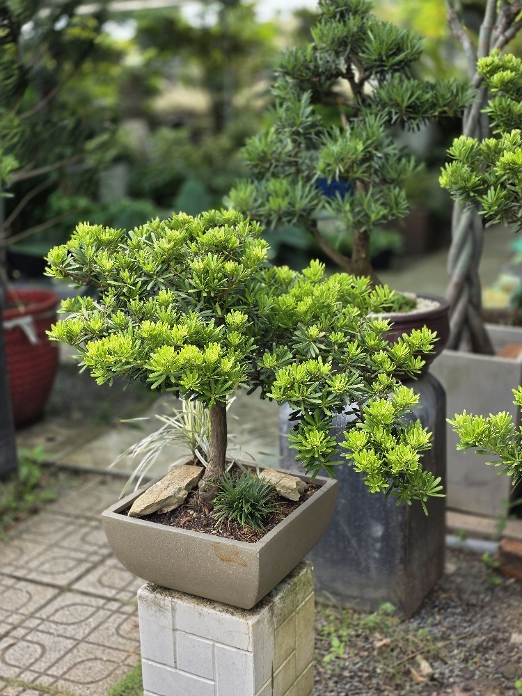 Vạn Niên Tùng (Podocarpus macrophyllus), hay còn gọi là Vạn Niên Tùng, là loài cây thân gỗ thường xanh, có nguồn gốc từ Nhật Bản và các vùng ôn đới châu Á. Loài cây này được biết đến với khả năng chịu đựng khắc nghiệt của thời tiết, sự trường tồn qua nhiều thế kỷ, và vẻ đẹp độc đáo của lá kim xanh mướt quanh năm. Đặc tính này làm cho Vạn Niên Tùng trở thành lựa chọn hoàn hảo để tạo nên những tác phẩm Bonsai trường tồn với thời gian.
