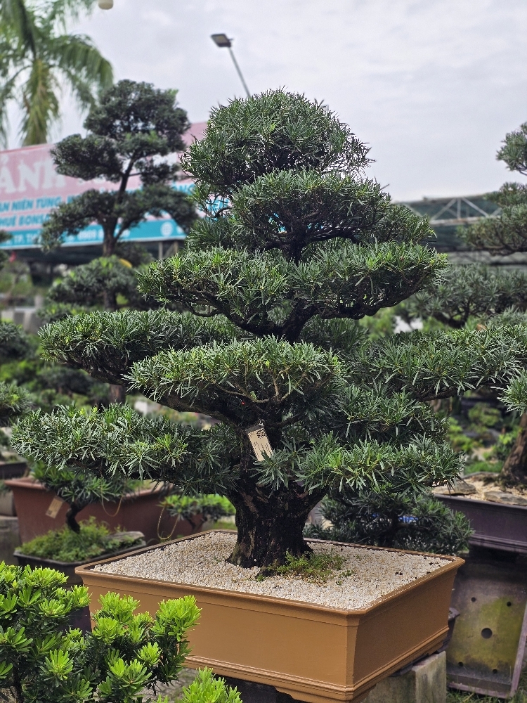 Vạn Niên Tùng (Podocarpus macrophyllus), hay còn gọi là Vạn Niên Tùng, là loài cây thân gỗ thường xanh, có nguồn gốc từ Nhật Bản và các vùng ôn đới châu Á. Loài cây này được biết đến với khả năng chịu đựng khắc nghiệt của thời tiết, sự trường tồn qua nhiều thế kỷ, và vẻ đẹp độc đáo của lá kim xanh mướt quanh năm. Đặc tính này làm cho Vạn Niên Tùng trở thành lựa chọn hoàn hảo để tạo nên những tác phẩm Bonsai trường tồn với thời gian.