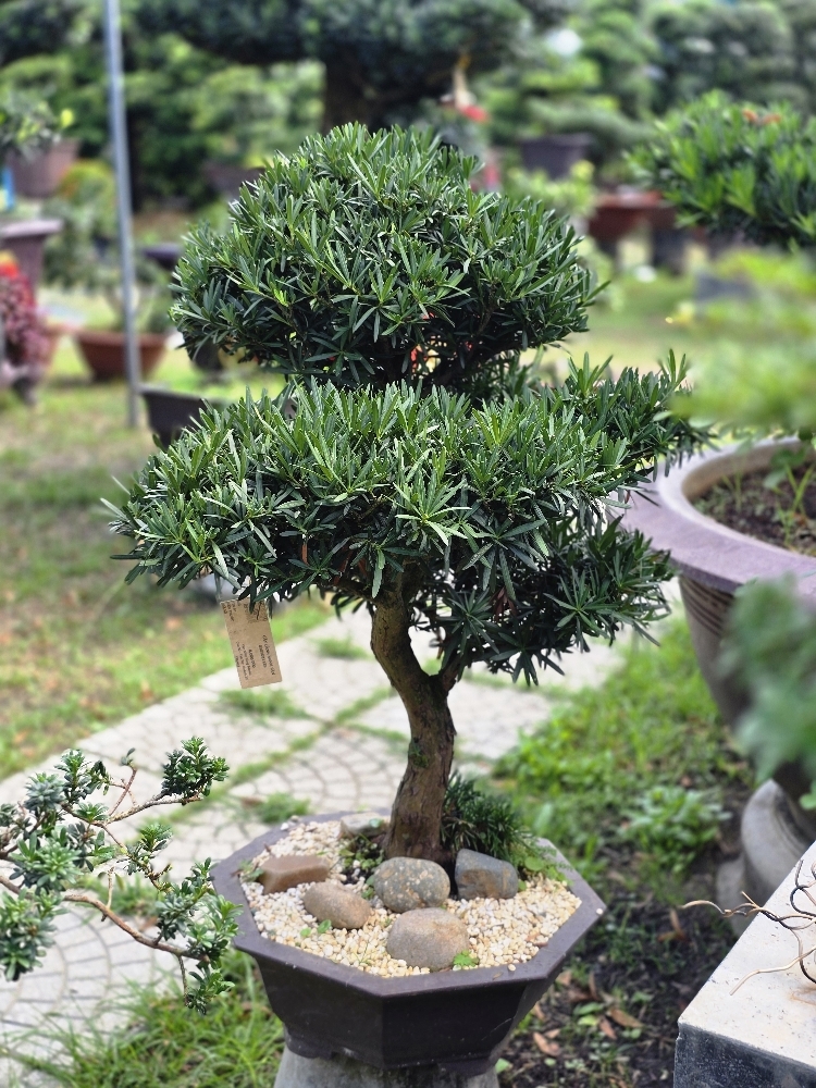 Vạn Niên Tùng (Podocarpus macrophyllus), hay còn gọi là Vạn Niên Tùng, là loài cây thân gỗ thường xanh, có nguồn gốc từ Nhật Bản và các vùng ôn đới châu Á. Loài cây này được biết đến với khả năng chịu đựng khắc nghiệt của thời tiết, sự trường tồn qua nhiều thế kỷ, và vẻ đẹp độc đáo của lá kim xanh mướt quanh năm. Đặc tính này làm cho Vạn Niên Tùng trở thành lựa chọn hoàn hảo để tạo nên những tác phẩm Bonsai trường tồn với thời gian.